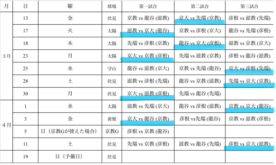 春季リーグ戦2026 試合予定 kyodaijunko 2026年2月27日 コメントはありません Tweet 春季リーグ戦の試合予定が以下のように決定いたしましたのでご報告いたします。 なお、プレイボール時間は 第一試合 9時 第二試合 11時30分 第三試合 14時 となります。 試合状況により、多少時間が前後する場合がございます。ご了承ください。